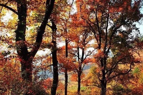 深秋季节满山红叶,如一片丹霞落在朱锡岭,丛丛红叶在满山青松簇拥下,极似丹青妙手的浓墨杰作。